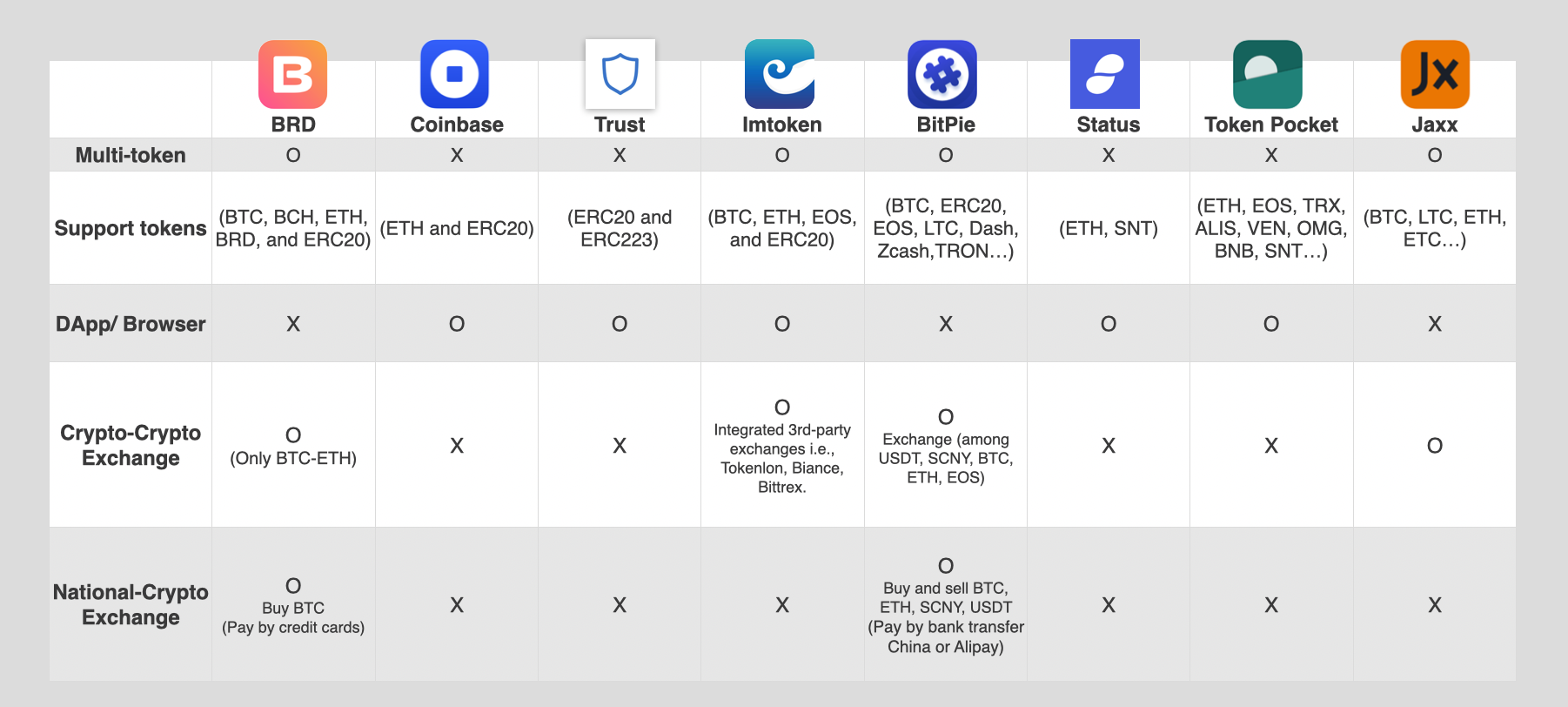 We analyzed eight decentralized wallet competitors (BRD, Coinbase, Trust, ImToken, BitPie, Status, Token Pocket, and Jaxx) on iOS to evaluate their unique features and market positioning. This assessment helped identify key design opportunities and insights to enhance the development of DEXON Wallet.