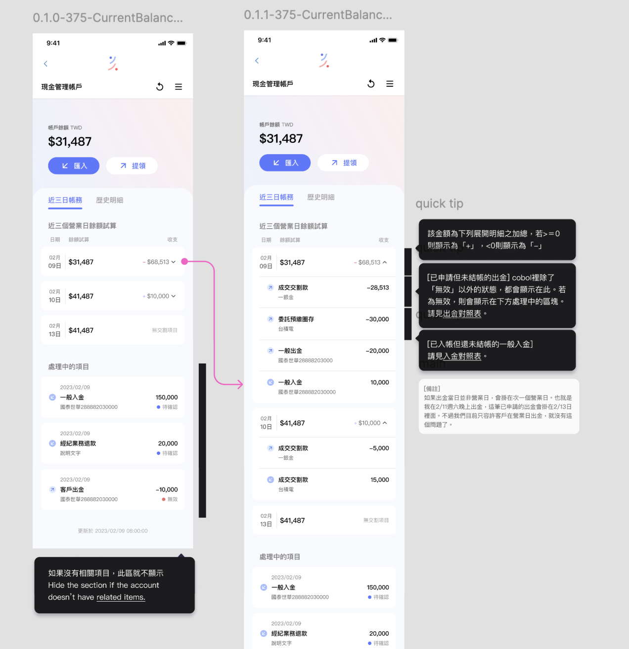 To accelerate the product launch and testify CMA integration, the front-end was implemented as an in-app browser, seamlessly integrating cash flow management within the existing securities trading app. Users could deposit, withdraw, and view their account balances, while the back-end leveraged the company's legacy COBOL system for execution. From initial design to development-ready testing, the entire process took less than two months.